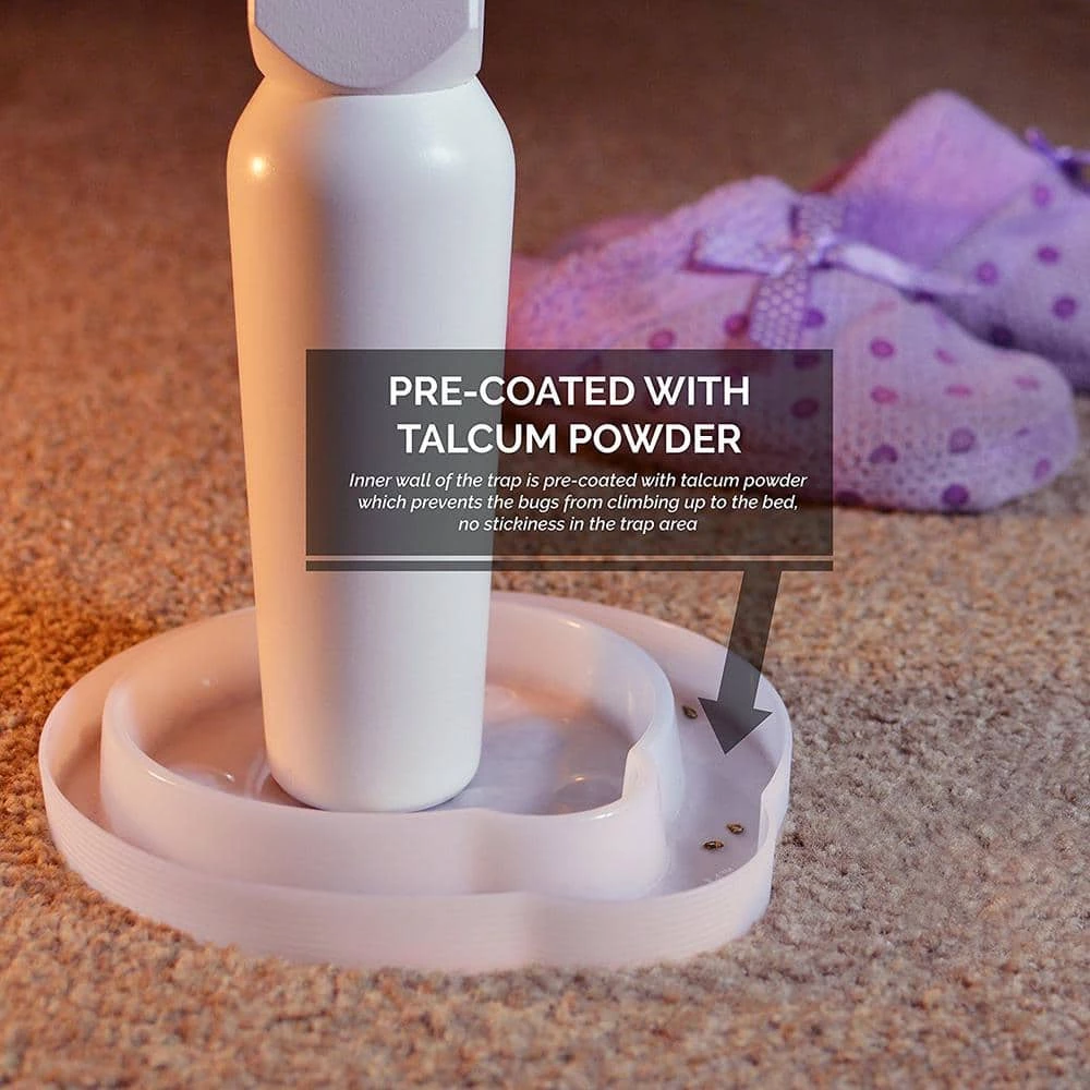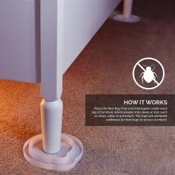 The Bed Bug Trap and Interceptor is an innovative tool to detect and monitor bed bug infestations in your home. By placing the Bed Bug Trap and Interceptor under each leg of furniture, where you may rest, such as beds, sofas, or armchairs, the Bed Bug Trap and Interceptor eliminates all pathways for bed bugs to lodge themselves in your home. The Bed Bug Trap and Interceptor is a pesticide free and environmentally friendly method of bed bug prevention. Features Grooved outer edge allows bed bugs to easily crawl up into the trap, achieving the detection and monitoring effect. Inner wall of the trap is pre-coated with talcum powder which prevents the bugs from climbing up to the bed, no stickiness in the trap area. Innovative and user-friendly design allows you to place furniture and trap right against the wall How it Works Place the Bed Bug Trap and Interceptor under each leg of furniture, where people may sleep or rest, such as beds, sofas, or armchairs. The trap will eliminate pathways for bedbugs to access furniture. The grooved walls of the device allow bed bugs to easily crawl up into the trap, and the inner walls are pre-coated with talcum powder to defend against pesky bed bugs. Bed bugs approaching the bed will be trapped and found in the outer ring. What’s included Bed Bug Trap and Interceptor (4 per pack), user-friendly instructions
