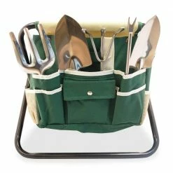 Gardening just got more relaxing with the GardenHOME Folding Stool with Tool Bag and 5 Tools All-in-One set, a folding seat and detachable polyester storage tote all-in-one. Lightweight and portable, this durable storage tote has external pockets for easy tool access from any angle. The GardenHOME Folding Stool with Tool Bag and 5 Tools All-in-One set conveniently holds the 5 stainless steel garden tools (1 trowel, 1 trans-planter, 1 cultivator, 1 weeding fork and 1 weeder) on the exterior of the tote so they are readily accessible when you need them. All 5-tools have wood handles. The GardenHOME Folding Stool with Tool Bag and 5-tools All-in-One set makes a perfect gift for those who love spending time working in their garden.