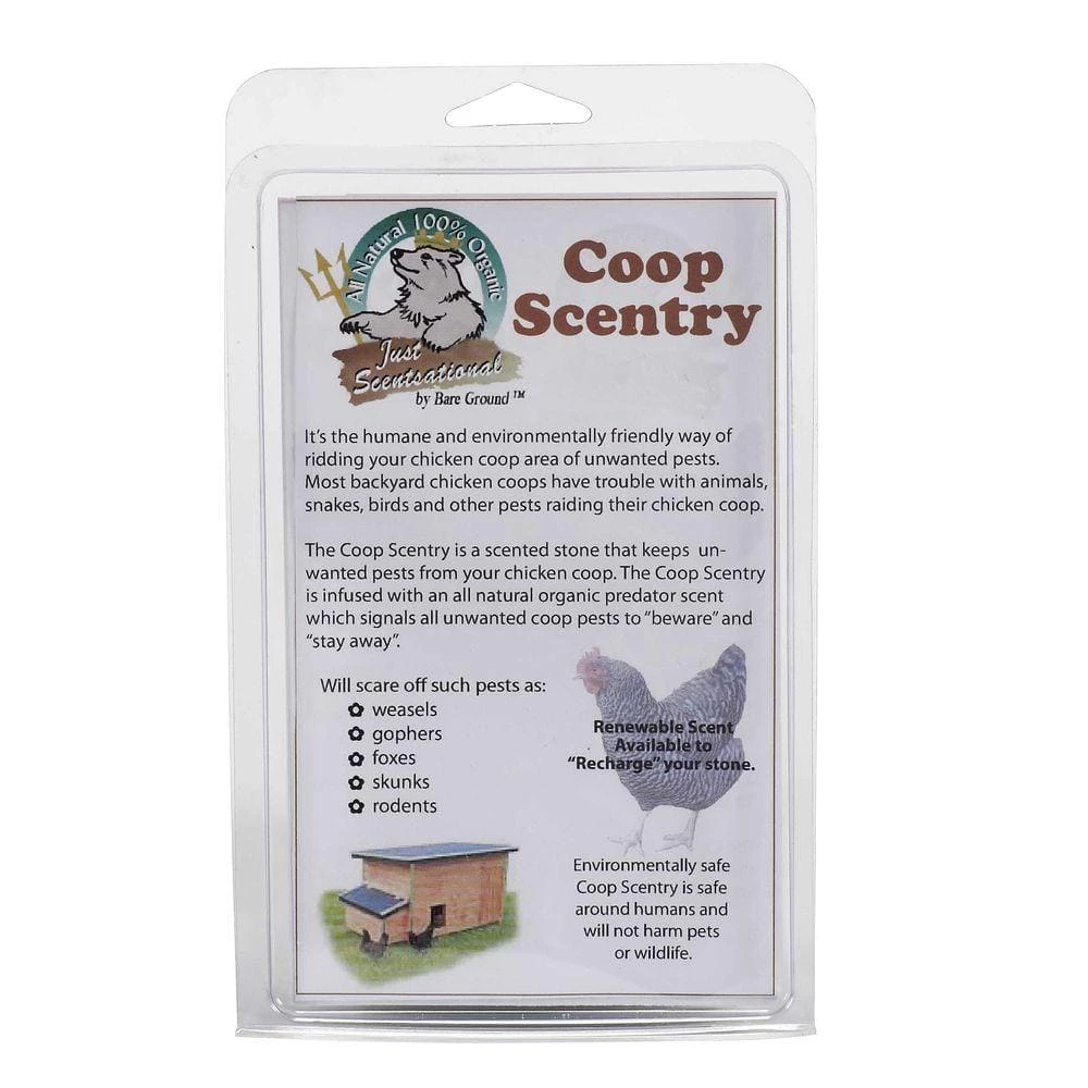 It’s the humane and environmentally friendly way of ridding your chicken coop area of unwanted pests. Most backyard chicken people have trouble with animals, snakes, birds and other pests raiding their chicken coop. The Coop Scentry is a scented protection stone keeps away weasels, foxes, skunks, rabbits, deer, squirrels, gophers, chipmunks, mice and other rodents. Place the predator scented Coop Scentry where you need the most protection from these pesky critters. For best results in large enclosures place 1 every 12 ft. to 16 ft. apart. The Coop Scentry is made of an all natural absorbent stone. Rechargeable scent is available when the Coop Scentry needs a recharge. Good for many months of outdoor protection.