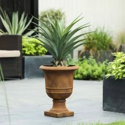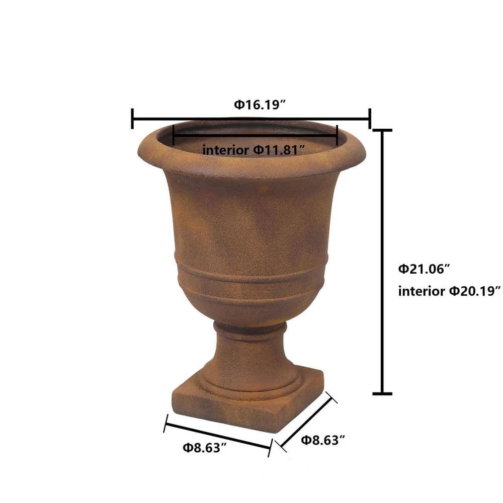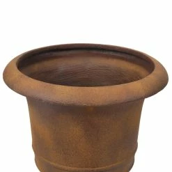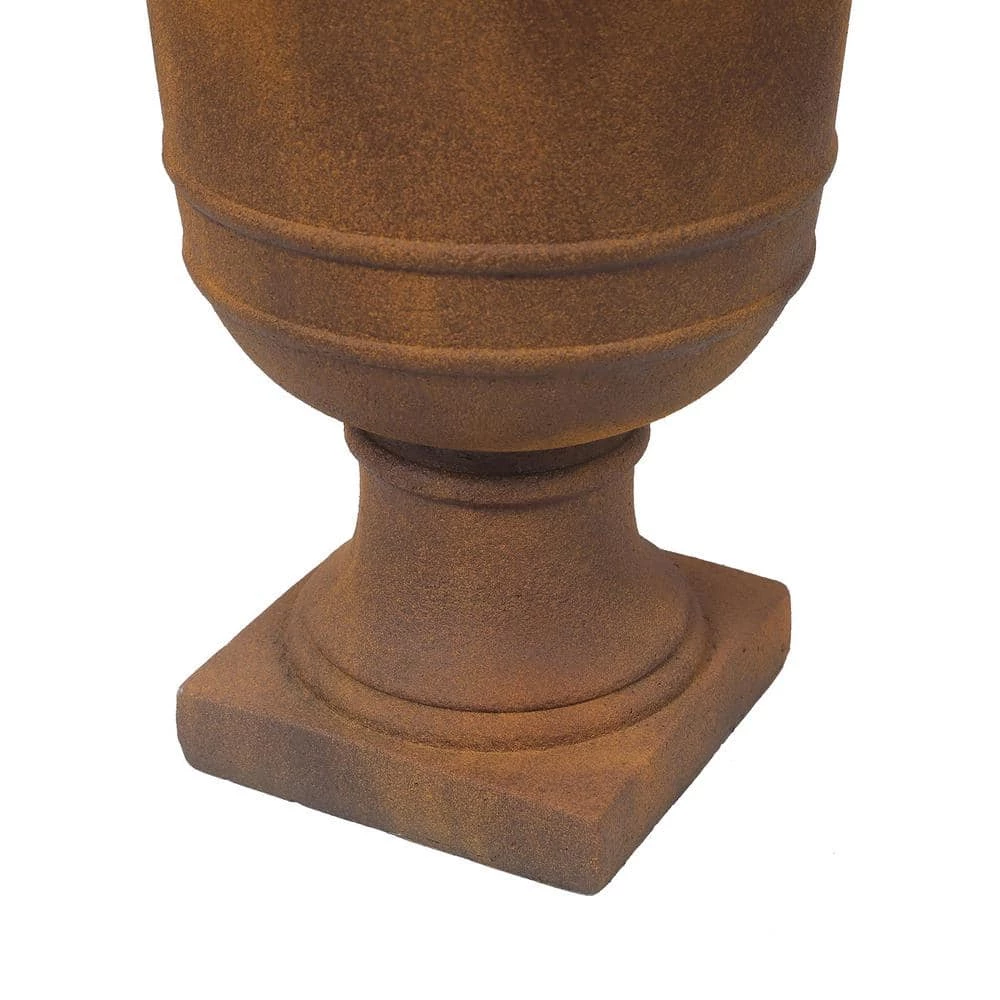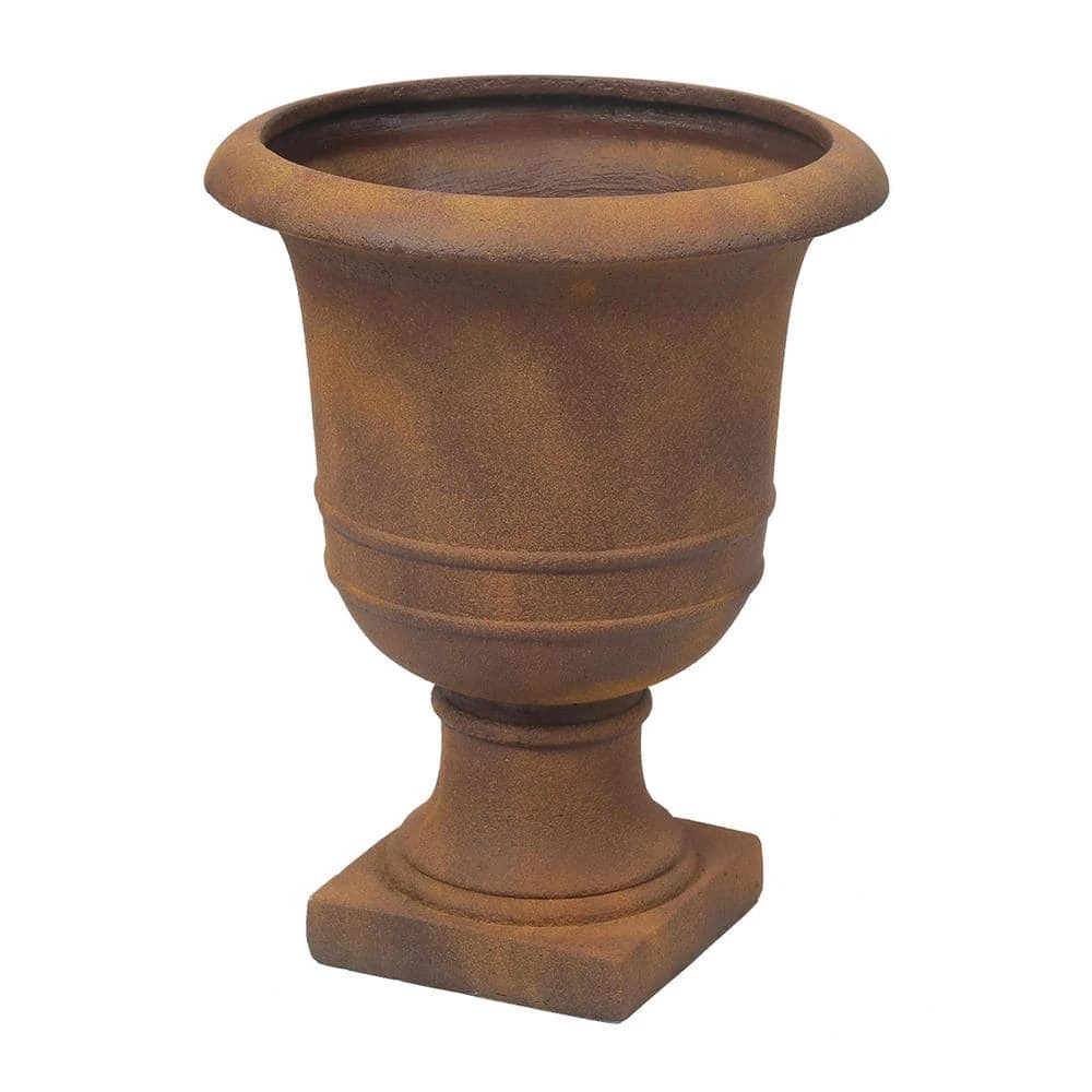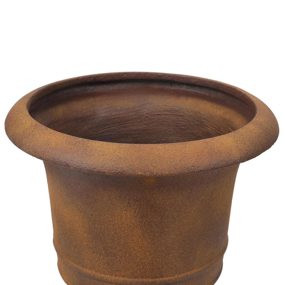 Enjoy your outdoor living area with this traditional urn planter. The planter is handmade from magnesium oxide (also called magnesia) material that is weather resistant and can be used outdoors. The magnesia urn planter has a rusty brown finish. The planter is ideal for any porch, patio or deck. The urn planter will also make a great addition to your indoor living space. The urn planter includes a drainage hole.