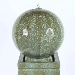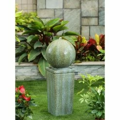 Carrying a strong silhouette, this outdoor Stone and Patina Finish Sphere on Pillar Fountain commands your attention in any space. The orb and pedestal of the fountain comes in a stone and patina finish, adding a tone of warmth to the feature. The square shape of the pedestal pairs with the soft lines of the orb, creating a multi-faceted fountain perfect for a variety of spaces. Made of sturdy cement, this fountain is perfect for outdoors. The fountain can be placed anywhere in a garden or patio space delivering an impressive addition to your home. The sound and sight of bubbling water is sure to help tie the serene garden together. Electric pump is included.