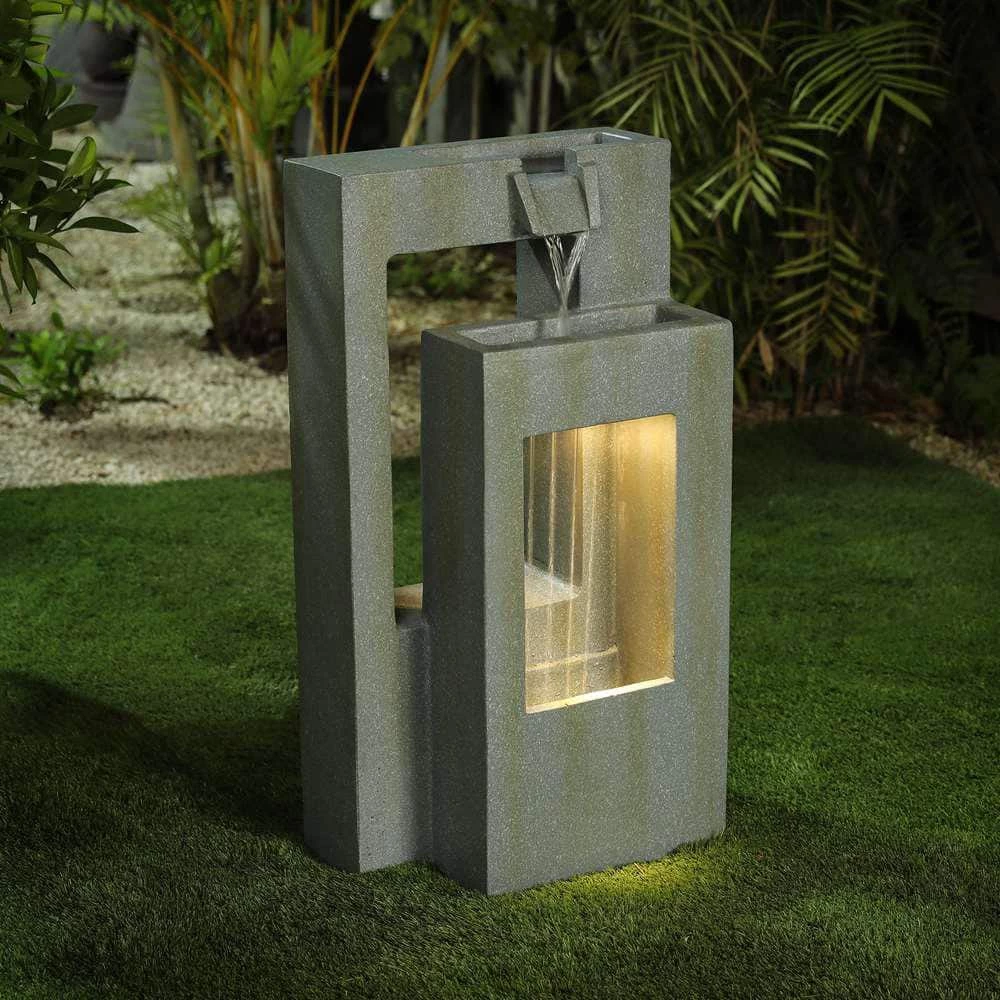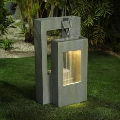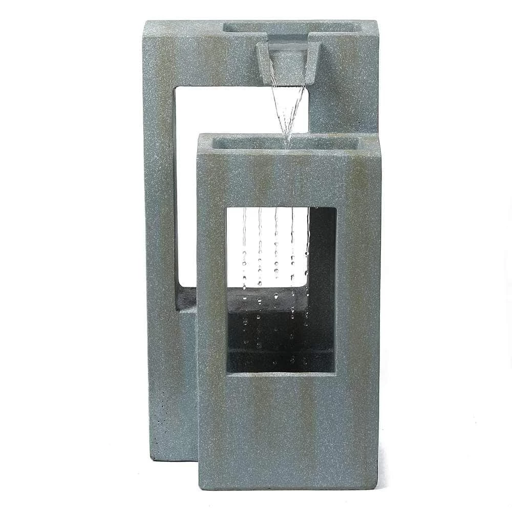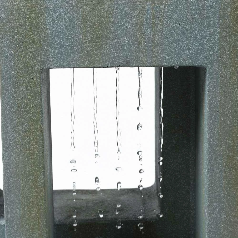 Carrying a strong silhouette, this outdoor modern stone finish fountain is gorgeous with its column sculpture. Made of sturdy cement, this fountain is perfect for outdoors. The fountain features 2 rectangular columns with the larger 1 flowing water to the smaller rectangular column that rains the water to its base. This modern style fountain will make an impressive addition to your home. The sound and sight of bubbling water is sure to help tie the serene garden together. Electric pump is included.