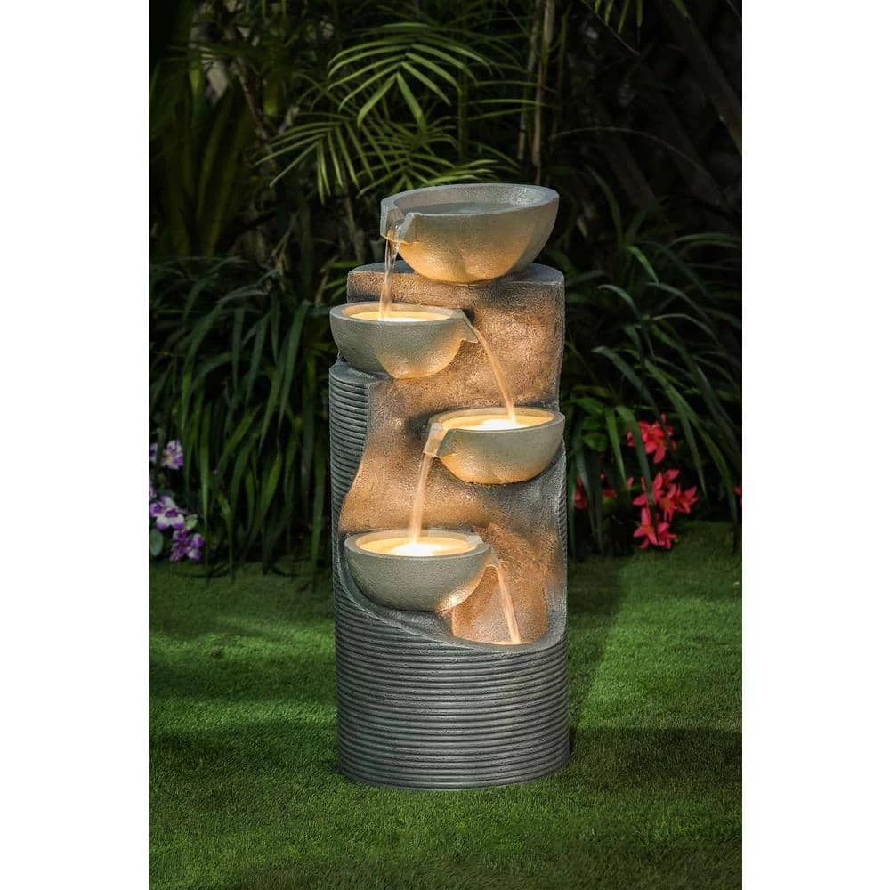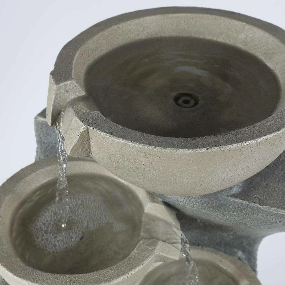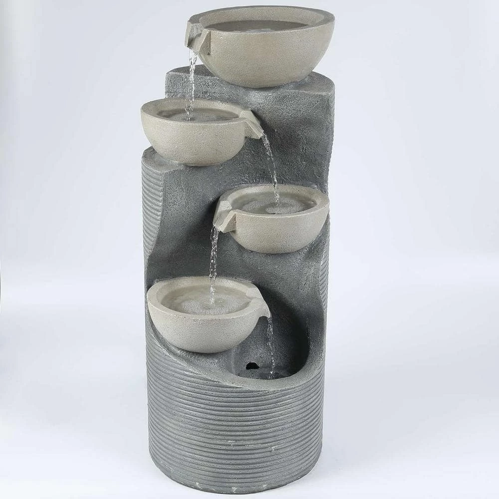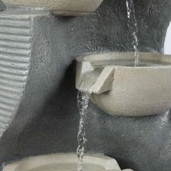 Make this outdoor tiered pot fountain a highlight of your landscape. Ideal for a patio or garden, this water feature is a modern piece of outdoor decor that is sure to impress your guests. The fountain features water cascading down the pots staggered on a round stone finish column. Relax as you listen to the water as it gently bubbles and circulates from the top to the inside of the base. The fountain can be placed anywhere in a garden or patio space delivering an impressive addition to your home. The sound and sight of bubbling water is sure to help tie the serene garden together. Electric pump is included.