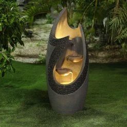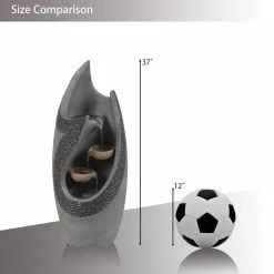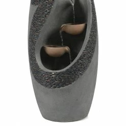 Carrying a strong silhouette, this outdoor modern dark stone finish fountain is gorgeous in its curved and textured column. Made of sturdy cement, this fountain is perfect for outdoors. The fountain has a curved column that features bowls inside flowing water to the base. This modern style fountain will make an impressive addition to your home. The sound and sight of bubbling water is sure to help tie the serene garden together. Electric pump is included.
