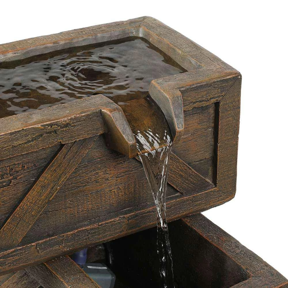 Give your garden or patio a rustic touch with this farmhouse themed outdoor cement fountain. This rustic outdoor fountain features 5 stacked wood crates with water cascading from the top crate to the crate just below it. The bottom 3 crates are for visual effect only and give the fountain additional height. Made of sturdy cement, this fountain is perfect for outdoors. This charming fountain will make an impressive addition to your home. The sound and sight of bubbling water is sure to help tie the serene garden together. Electric pump is included.