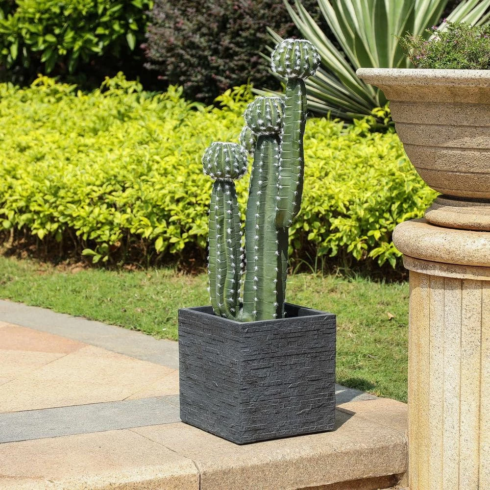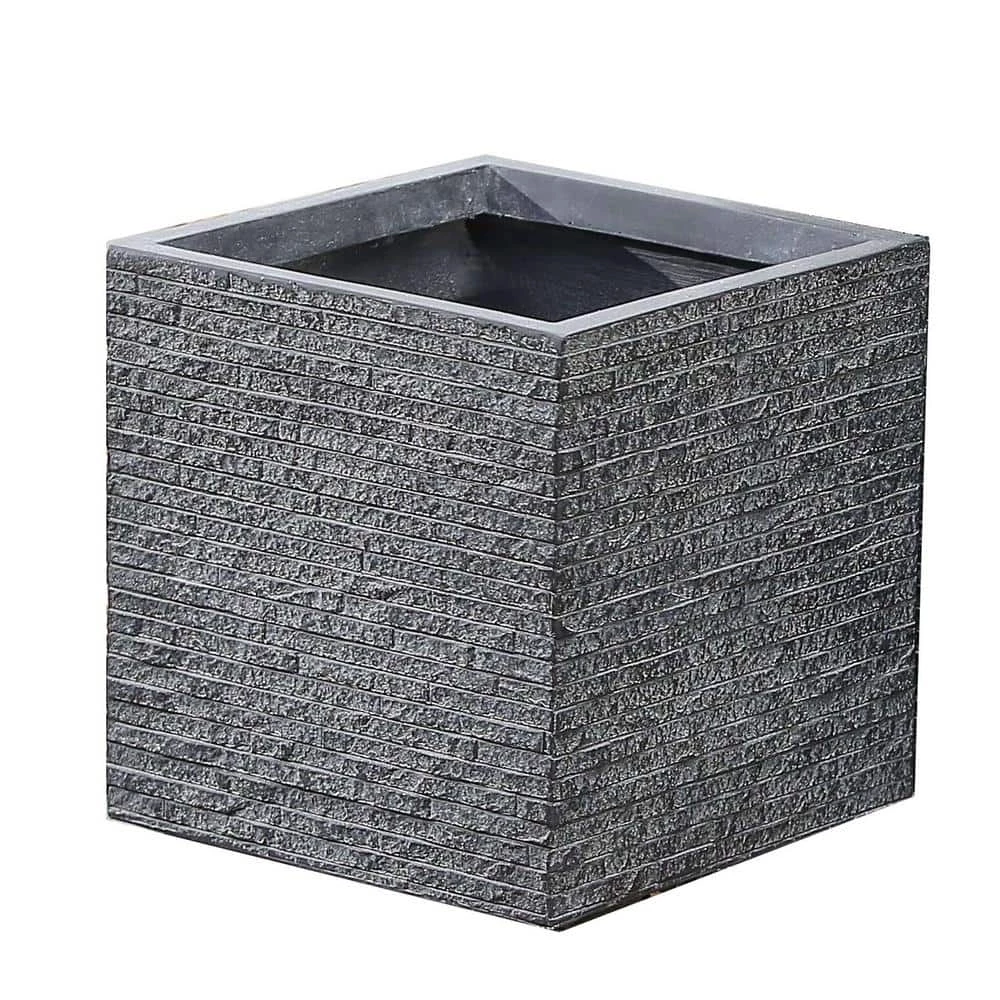 This textured, stone finish, square pot planter is made of durable fiberclay, and is suitable for year round use outdoors in your garden, patio, or porch. With its modern-style horizontal etched lines, and textured body, the planter will make a warm ambiance to your indoors as well. The square planter is 12 in. H making it ideal for your larger foliage and plants. With its modern design, it is sure to add the finishing touch to your decor. The planter includes a drainage hole.