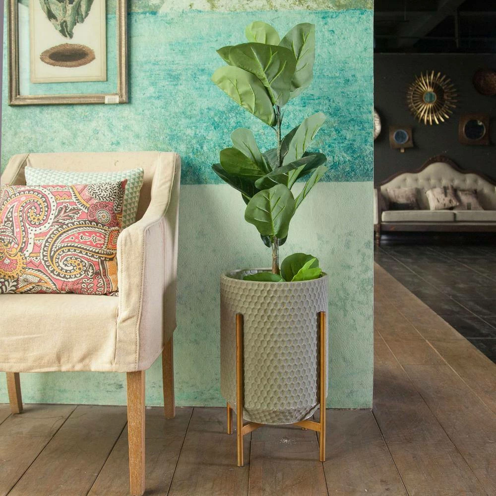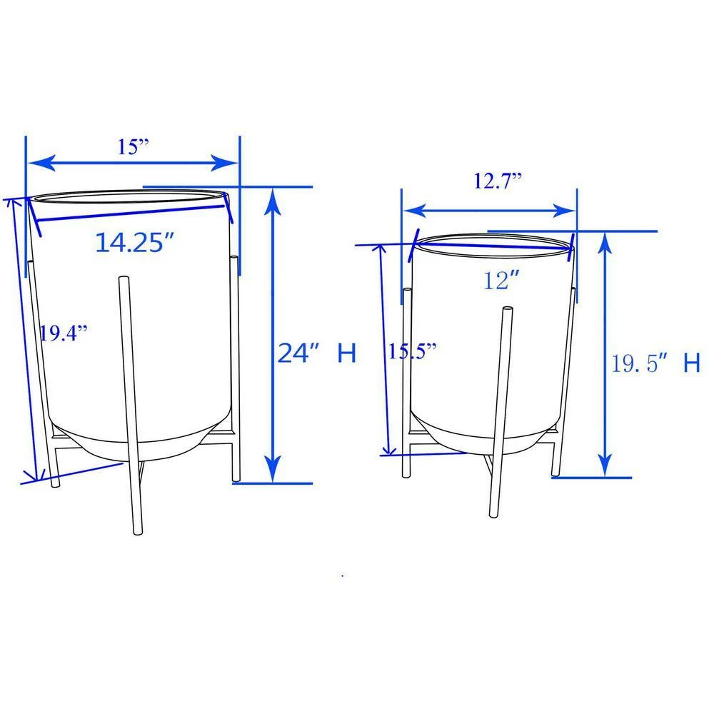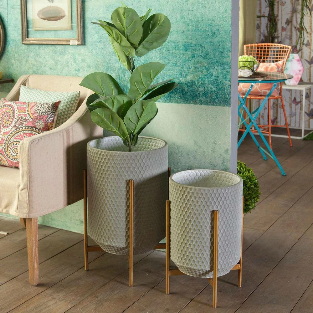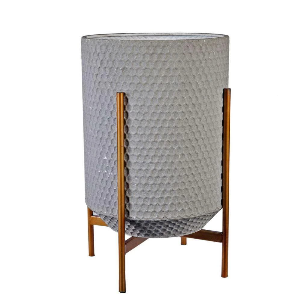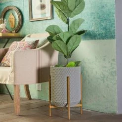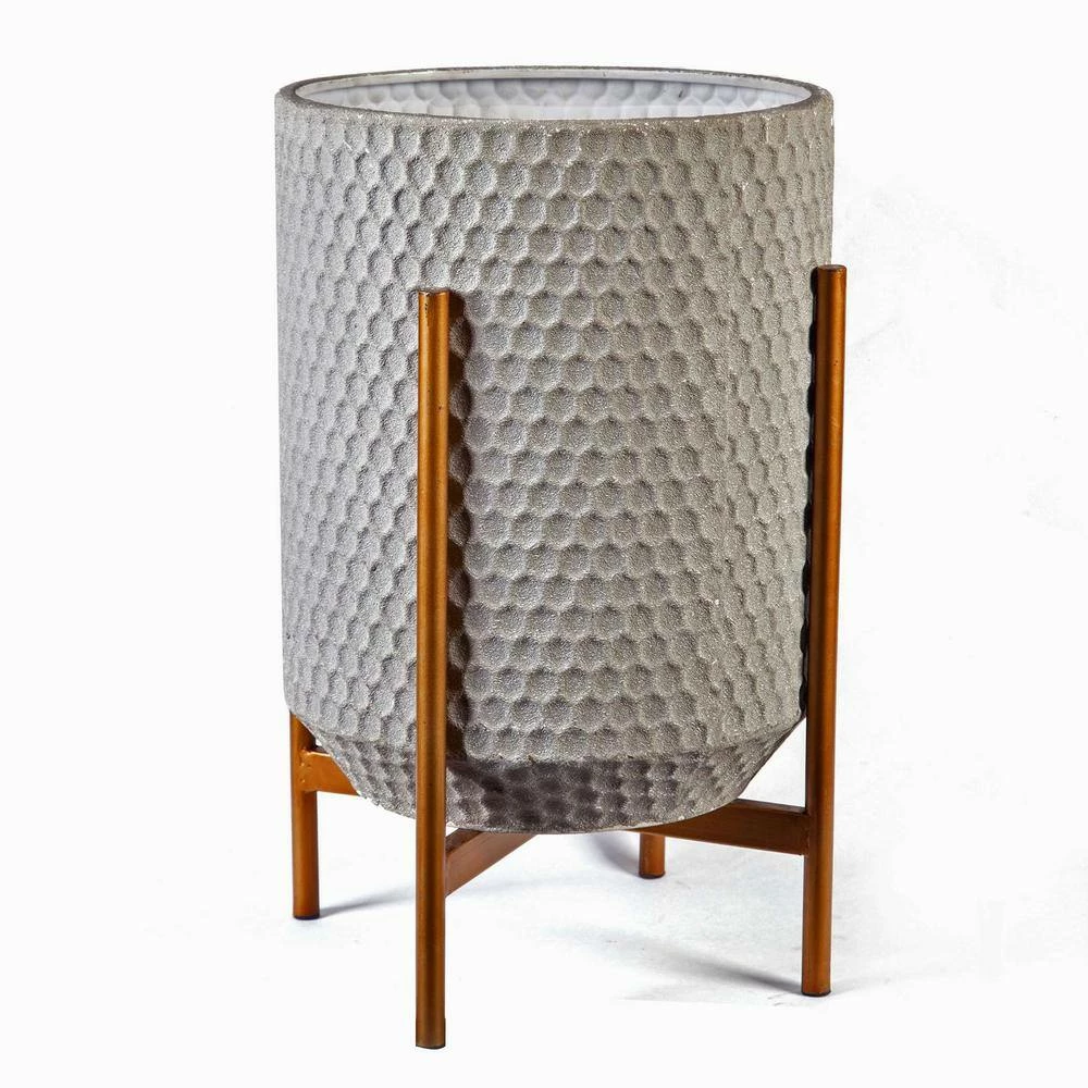 Elevate your greenery in this gorgeous metal cache pot set with a dimpled design in a grey finish, and a stand in gold finish. Each metal container fits easily on a gold finish stand, and fits with any style. The containers can be used as cache pots for your planters. The set includes a large and small planter that are identical in style and finish. The planters are ideal for showing off your indoor plants as cache pot. The metal containers are not waterproof.