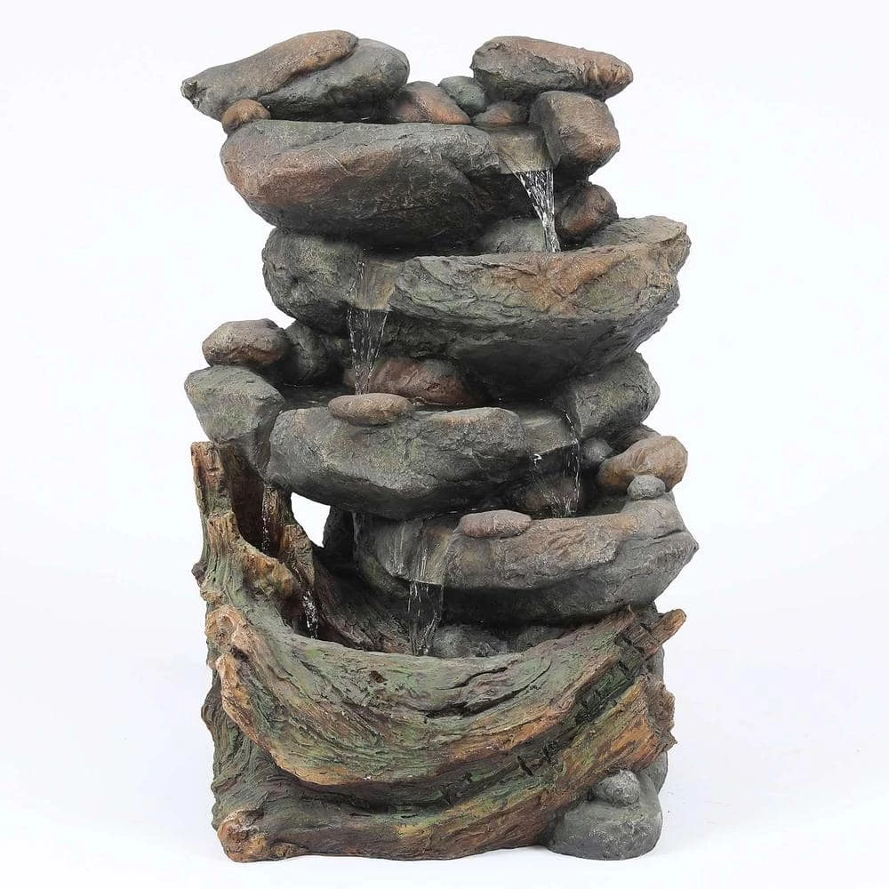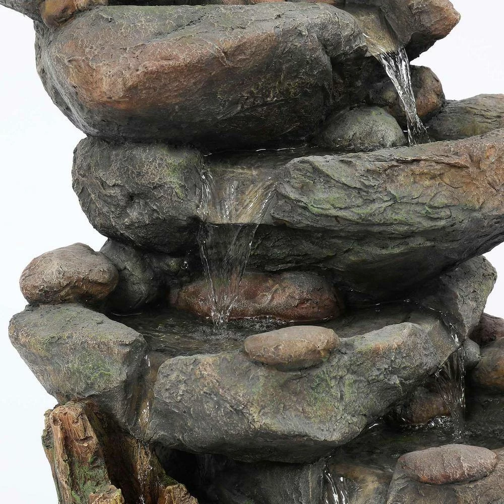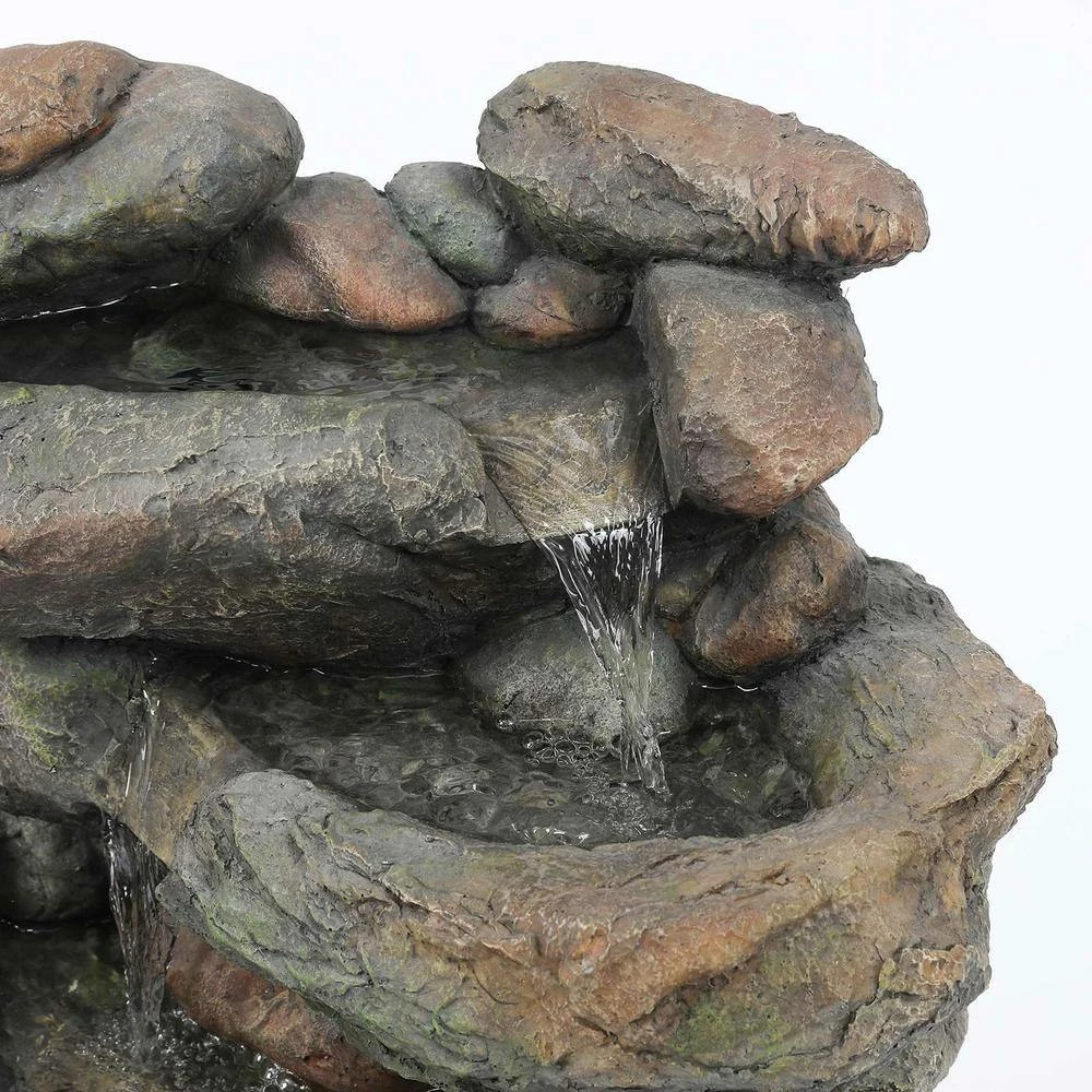 This outdoor fountain is features a stacked rocks playfully cascading down to a large rock basin. Made of polyresin, this fountain is perfect for outdoors. The rock cascading fountain completes your outdoor living space with its natural style. The sound and sight of cascading water is sure to help tie the serene garden together. Electric pump is included.