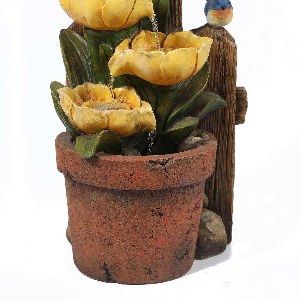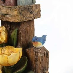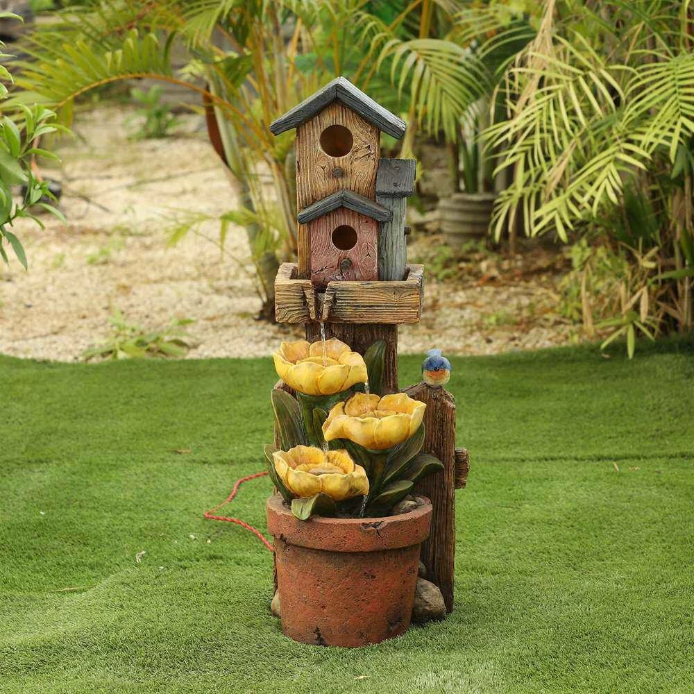 Give your garden or patio a rustic touch with this birdhouse themed outdoor polyresin fountain. This rustic outdoor fountain features 3-bird houses staggered on top of a wood post. The water flows from the wood crate down to beautiful yellow flowers in a clay planter. Made of sturdy polyresin, this fountain is perfect for outdoors. The fountain can be placed anywhere in a garden or patio space delivering an impressive addition to your home. The sound and sight of bubbling water is sure to help tie the serene garden together. Electric pump is included.