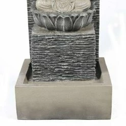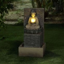 Feel the Zen with the calming flow of water with this traditional Buddha fountain. Ideal for smaller spaces, this fountain is compact at 25.6 in. tall and 12.6 in. deep. The meditating Buddha sculpture is seated on top a column because water flows from the bowl down the wall of the base of the fountain. It features a smooth waterfall as well as a LED light to bring the fountain to life when it gets dark. The 2.1 ft. fountain is perfect for your meditation space, garden, patio, balcony or deck. Crafted from durable poly resin material, this fountain is made for the outdoors. It includes an electrical pump that gently re-circulates the water and powers the LED light. The fountain is one-piece and is quick and easy to set-up.