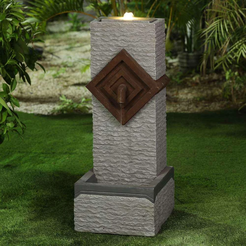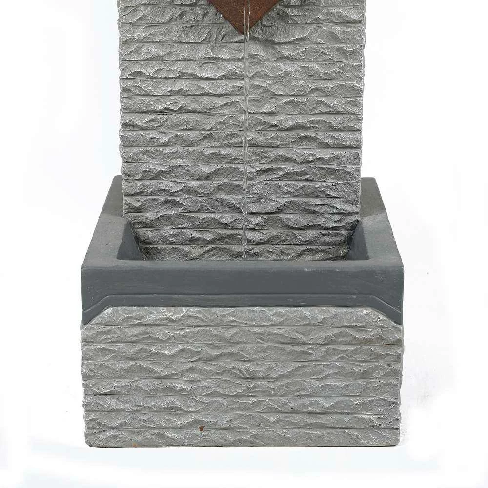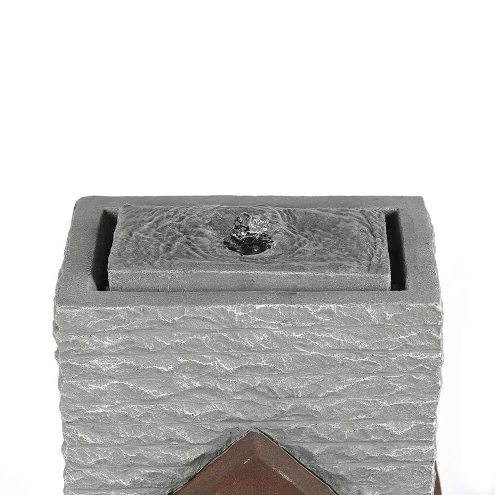 This soothing fountain feature is an easy way to bring a water feature to your outdoor living space. Make this modern style fountain the centerpiece of our outdoor living space. The poly resin fountain features a rectangular base in a textured gray stone-like finish. The top of the fountain is has a bubbling water feature. The textured gray finish adds to the beauty of the fountain, and gives it dimension and depth. Relax with your favorite book and drink on the patio, and listen to the soothing sounds of this stylish water feature. Electrical pump is included.