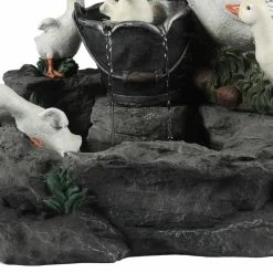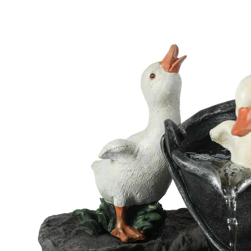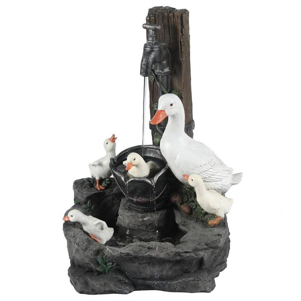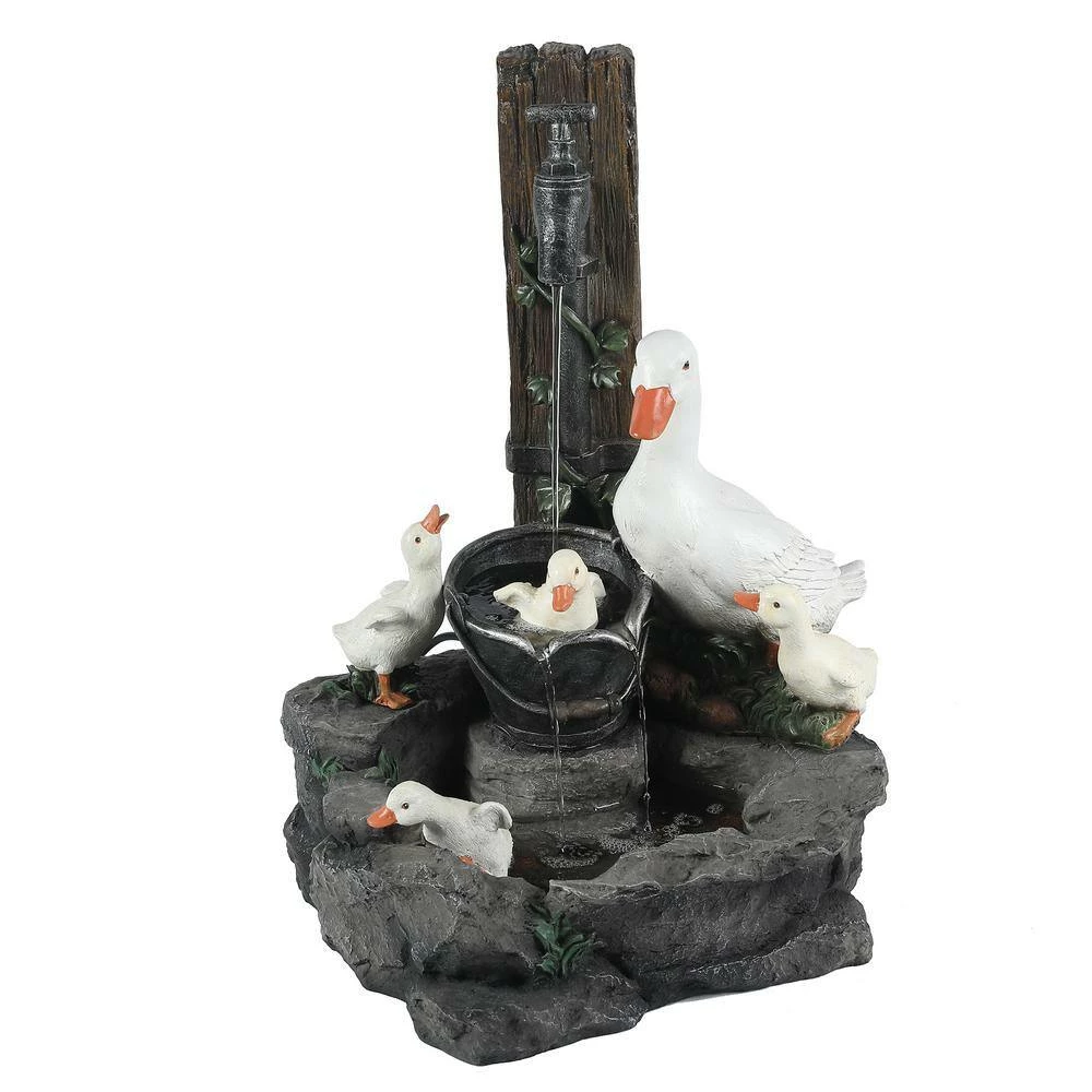 Enjoy your outdoor living area with this family of ducks taking a bath in your patio fountain. Made of sturdy polyresin, this fountain is perfect for outdoors. The patio fountain features a mama duck with her 4 ducklings at a water pump. The sound and sight of bubbling water is sure to help tie the serene garden together. Electric pump is included.