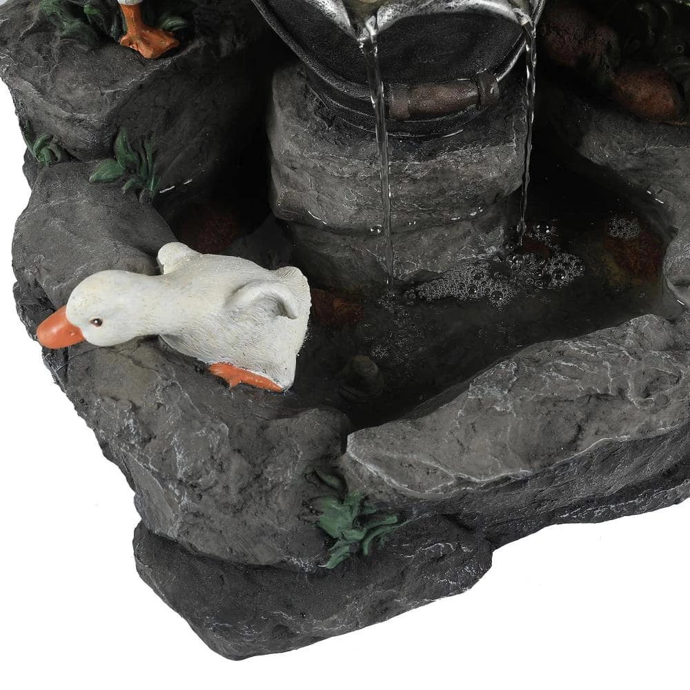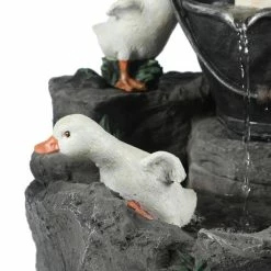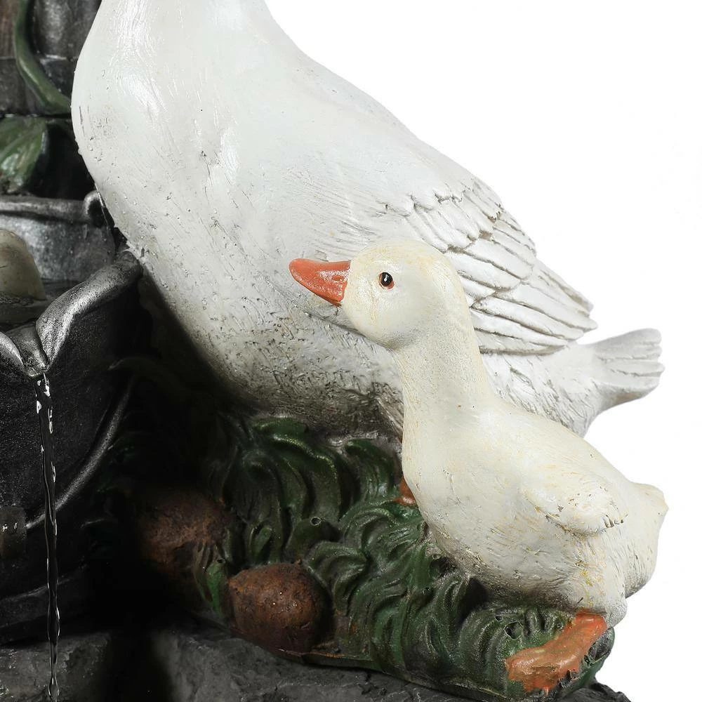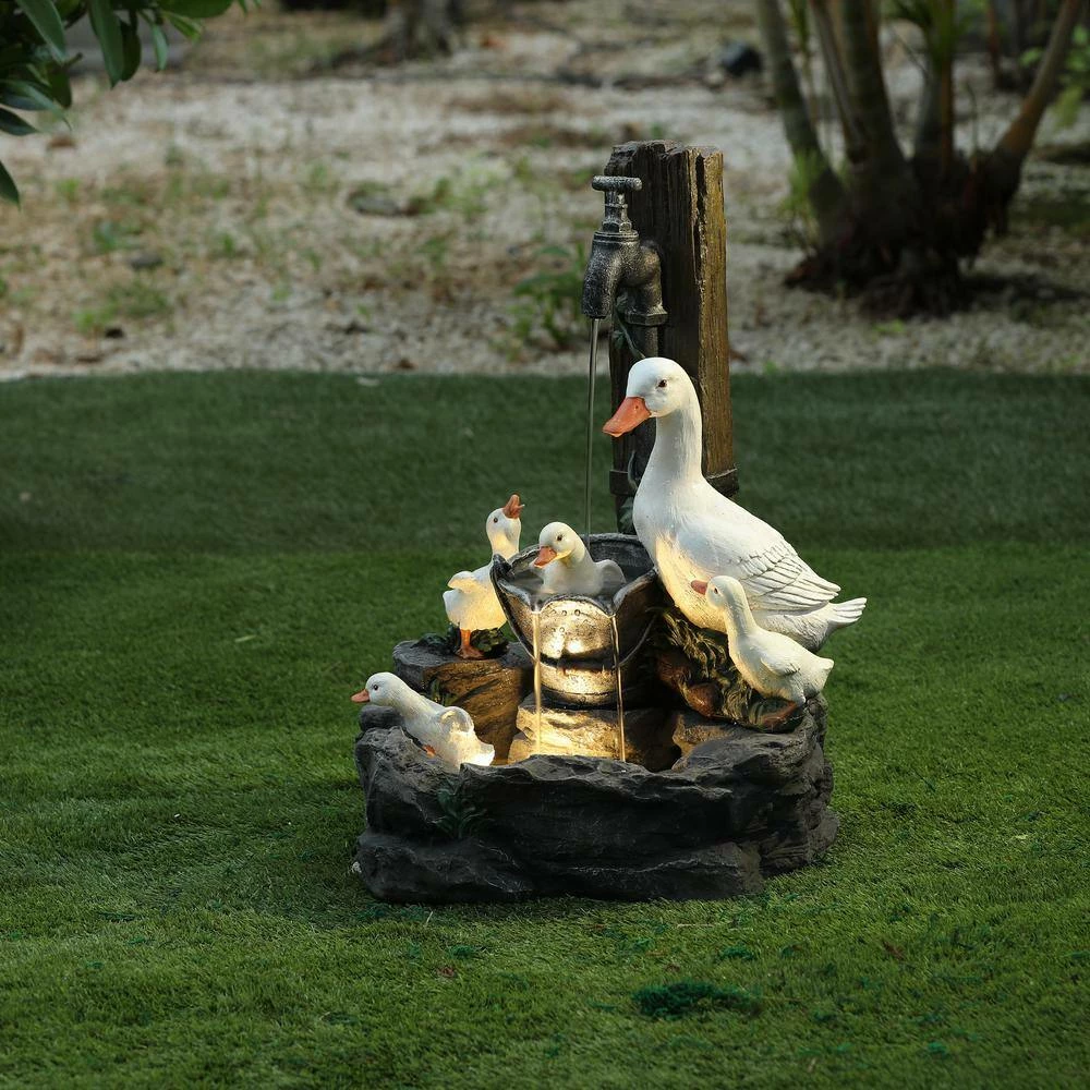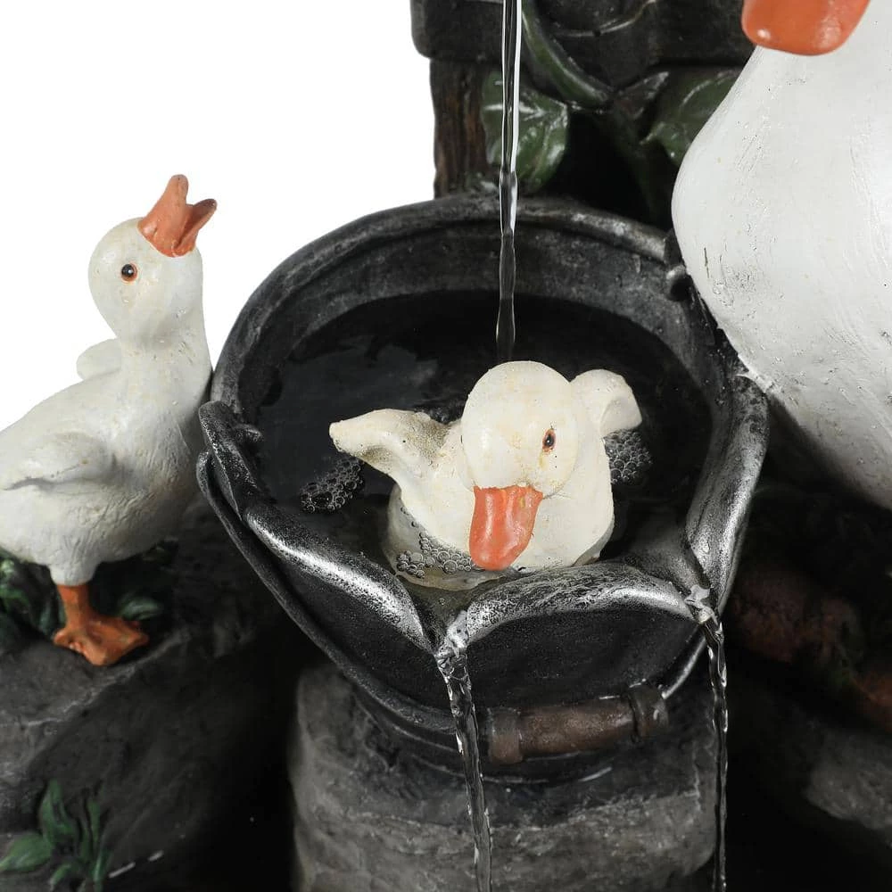 Enjoy your outdoor living area with this family of ducks taking a bath in your patio fountain. Made of sturdy polyresin, this fountain is perfect for outdoors. The patio fountain features a mama duck with her 4 ducklings at a water pump. The sound and sight of bubbling water is sure to help tie the serene garden together. Electric pump is included.