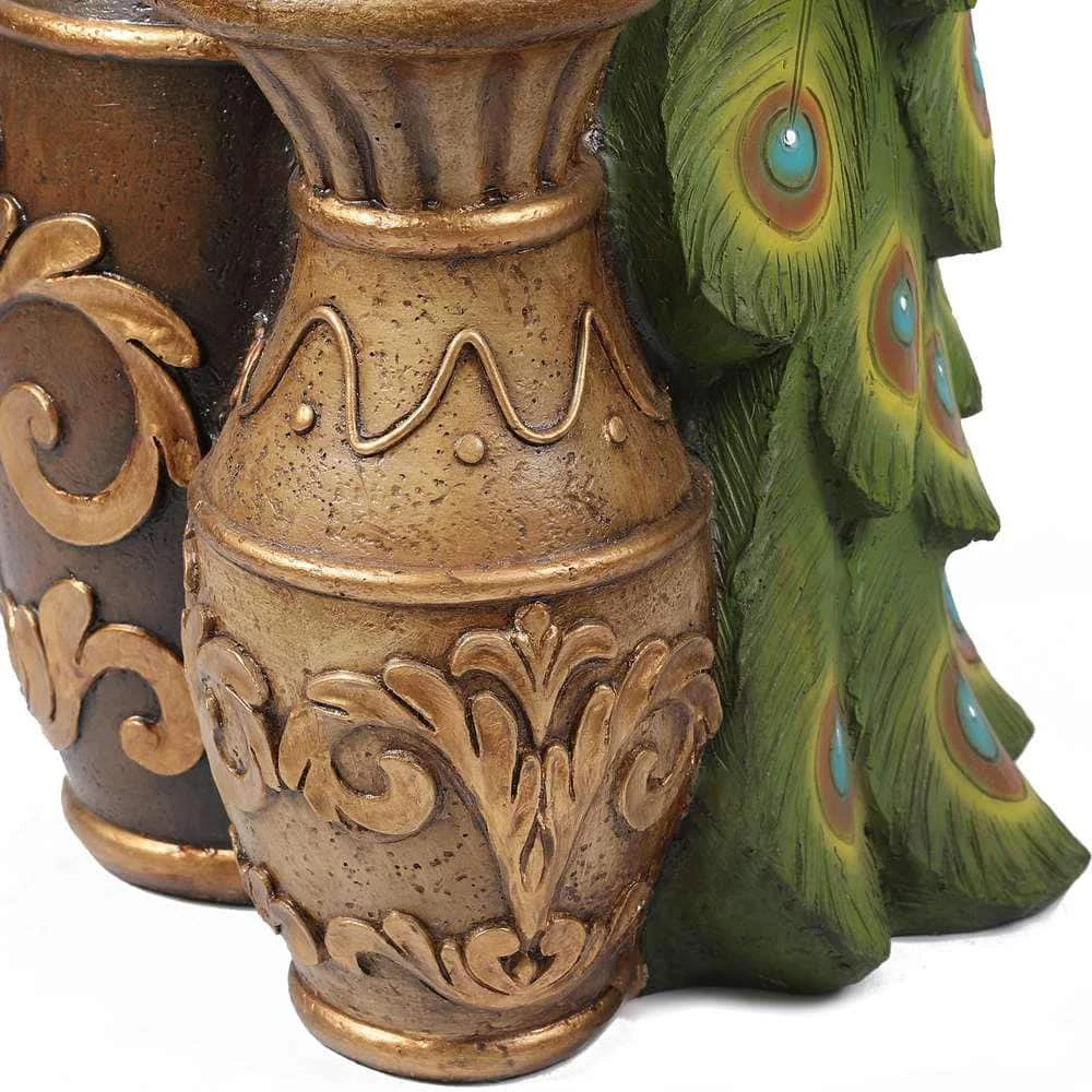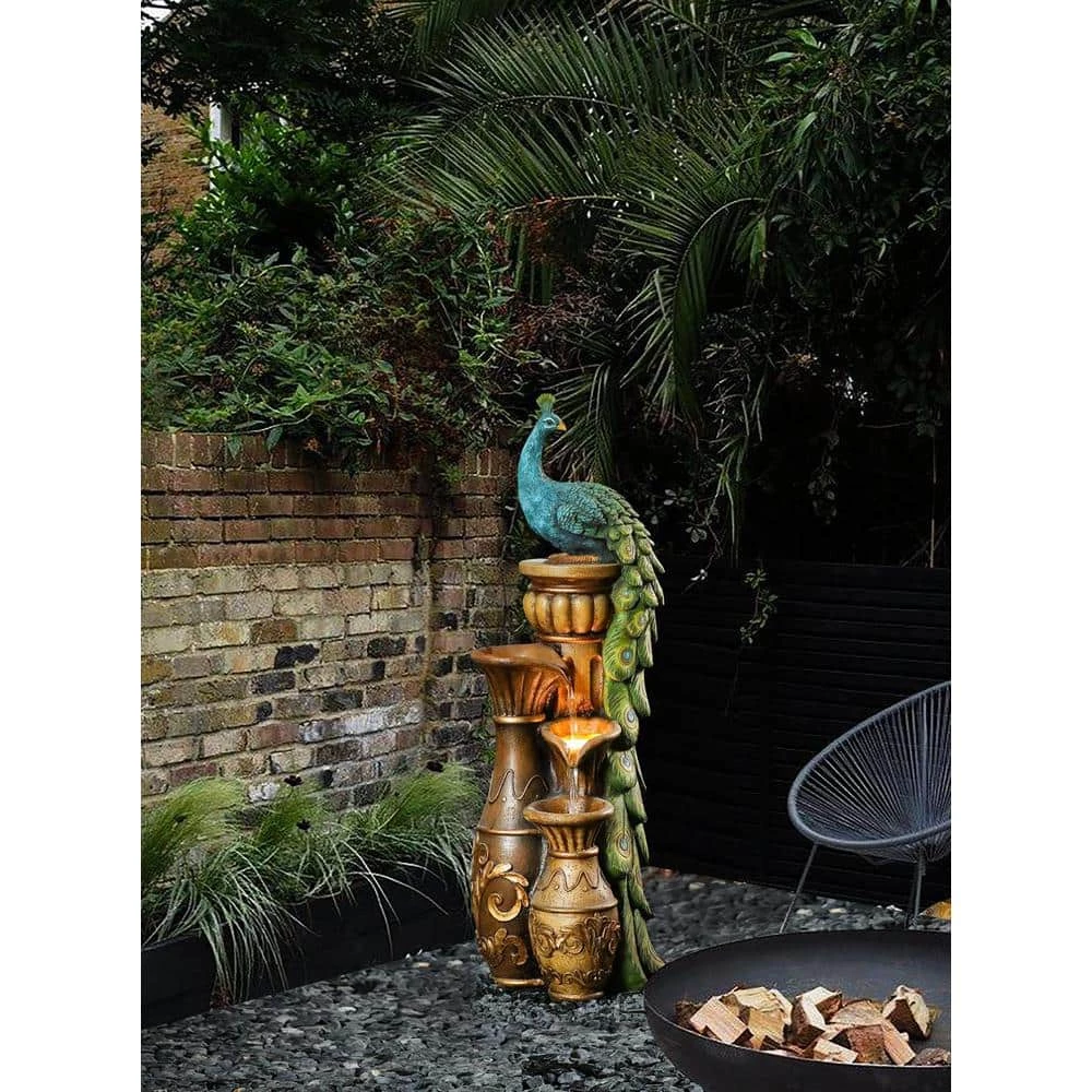 This beautiful outdoor fountain features a dazzling blue peacock with lovely detailed tail feathers and LED lights in the stylist urns. All of these details will make a warm addition to your outdoor living space. Made of sturdy polyresin this fountain is perfect for outdoors. The fountain can be placed anywhere in a garden or patio space delivering an impressive addition to your home. The sound and sight of bubbling water along with the accent LED lights is sure to help tie the serene garden together. Electric pump is included.