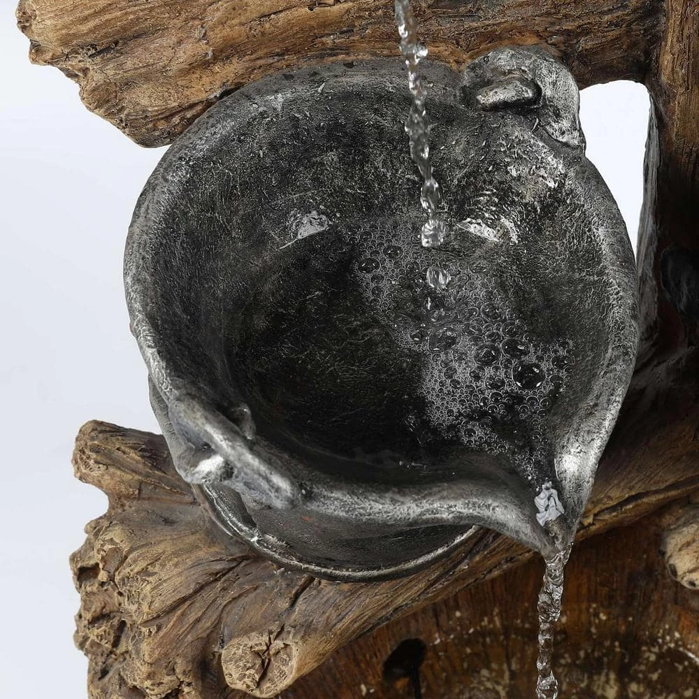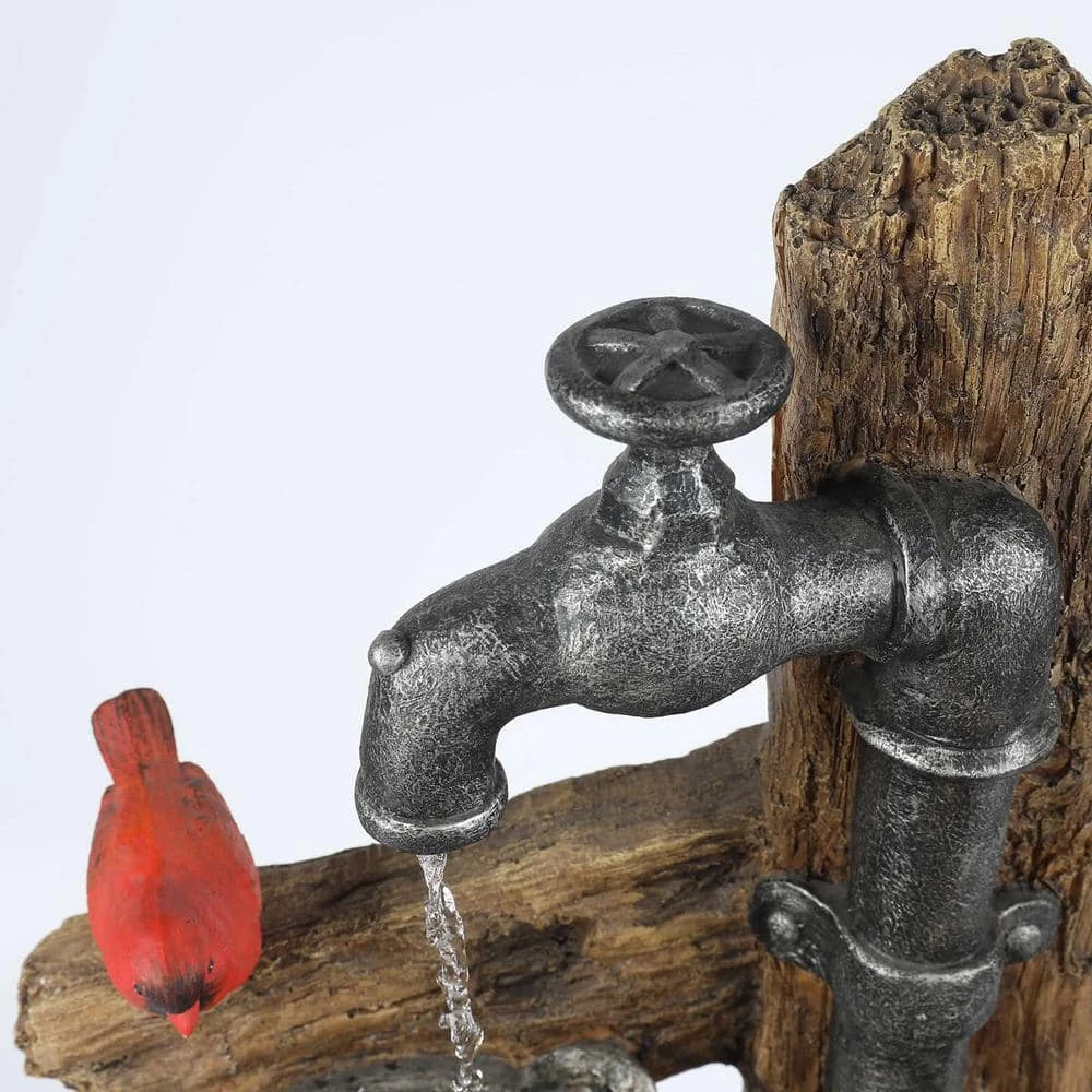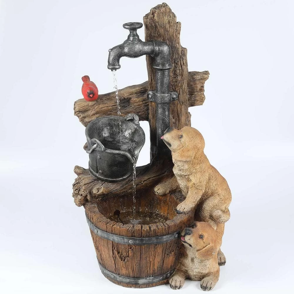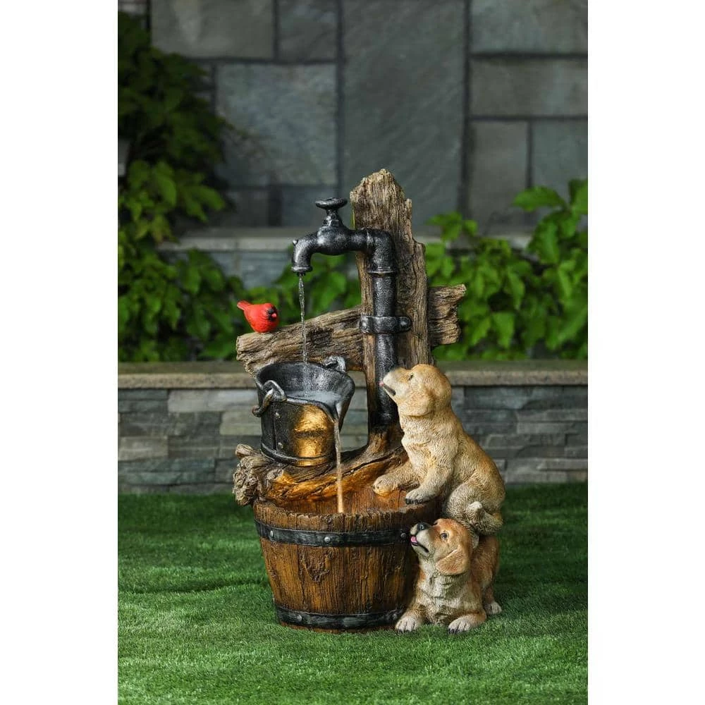 Bring the joy and whimsy to your outdoor living area with this puppies fountain. Made of sturdy polyresin, this fountain is perfect for outdoors. The patio fountain features 2 curious puppies at the water pump and a cardinal perched on the post. The sound and sight of bubbling water is sure to help tie the serene garden together. Electric pump is included.