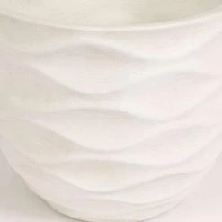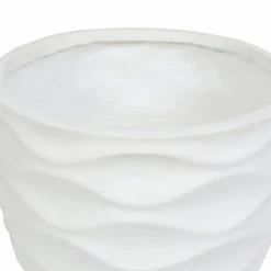 This wavy, white finish, round pot planter is made of durable MgO fiberclay, and is suitable for year round use outdoors in your garden, patio, or porch. With its beautifully white finish, the round planter will make a warm ambiance to your indoors as well. The planter weighs only 12.8 lbs. making it easy to move your planters from indoors to outdoors as needed. The round planter is 11.6 in. H making it ideal for your small and medium sized foliage and plants. The planter includes a drainage hole.