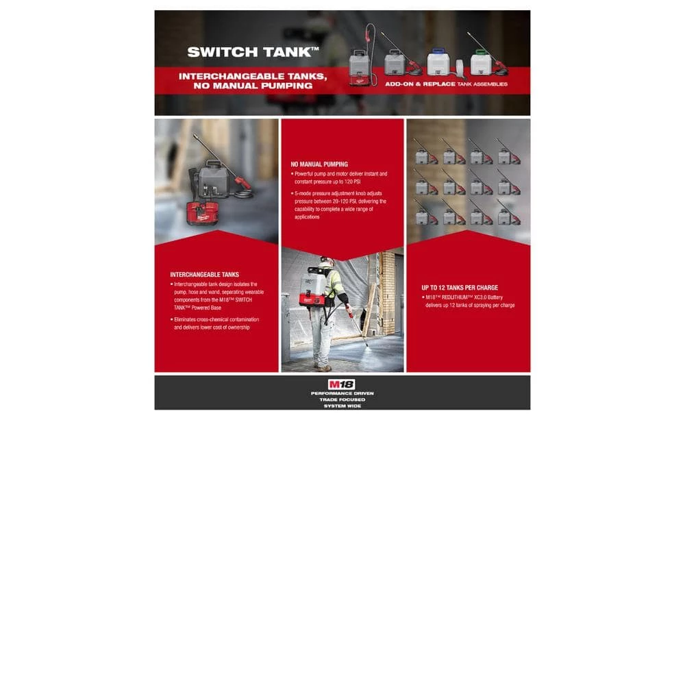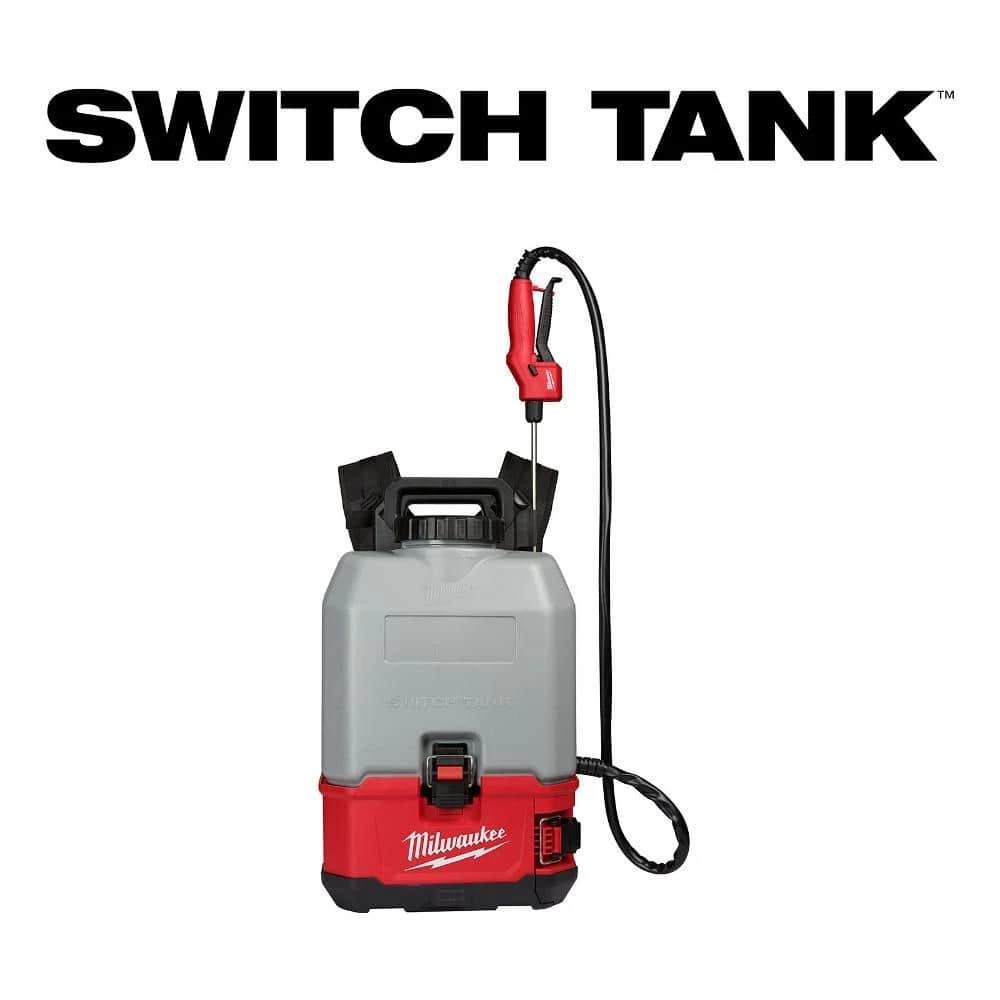 - Includes: M18 SWITCH TANK powered base, SWITCH TANK 4 Gal. concrete sprayer tank assembly, stainless steel wand, adjustable nozzle, fan nozzle, angled nozzle adaptor, M18 REDLITHIUM XC3.0 battery, M18/M12 multi-voltage charger, performance polarized safety glasses with gasket