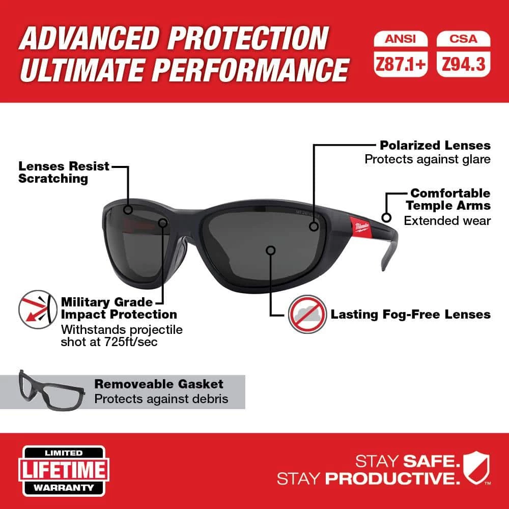 - 48-73-2045 polarized performance safety glasses feature: removable gasket protects against debris