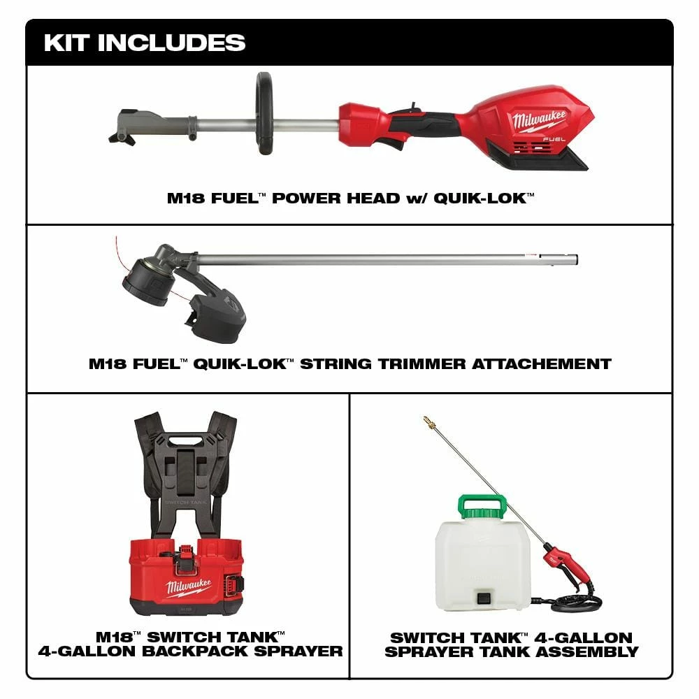 - Includes: M18 FUEL power head with QUICK-LOK (2825-20) and M18 FUEL QUIK-LOK string trimmer attachment (49-16-2717), M18 SWITCH TANK powered base, SWITCH TANK 4 Gal. sprayer tank assembly, stainless steel wand, adjustable nozzle, fan nozzle, angled nozzle adaptor