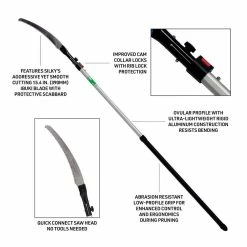 Notch Kiru Pole Saw features an oval profile with an ultra-lightweight aluminum construction. 2-section saw extends 13 ft. for maximum reach. Improved cam collar locks have rib lock protection. Quick-connect saw head allows for fast, tool-less assembly. Notch outfits the bottom pole with an abrasion-resistant, low-profile grip. Includes a 15.4 in. Silky Ibuki blade hard chrome-plated for durability and corrosion resistance with a custom-fit protective scabbard to keep the blade safe and sharp. Makes quick work of low-hanging cuts and its low weight allows for maximum maneuverability, efficiency and reach during use. This saw collapses in length to only 8 ft. (including head assembly) for easy storage. Notch covers this product with a limited lifetime warranty against defects in materials and workmanship.