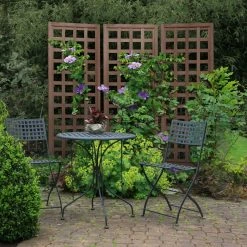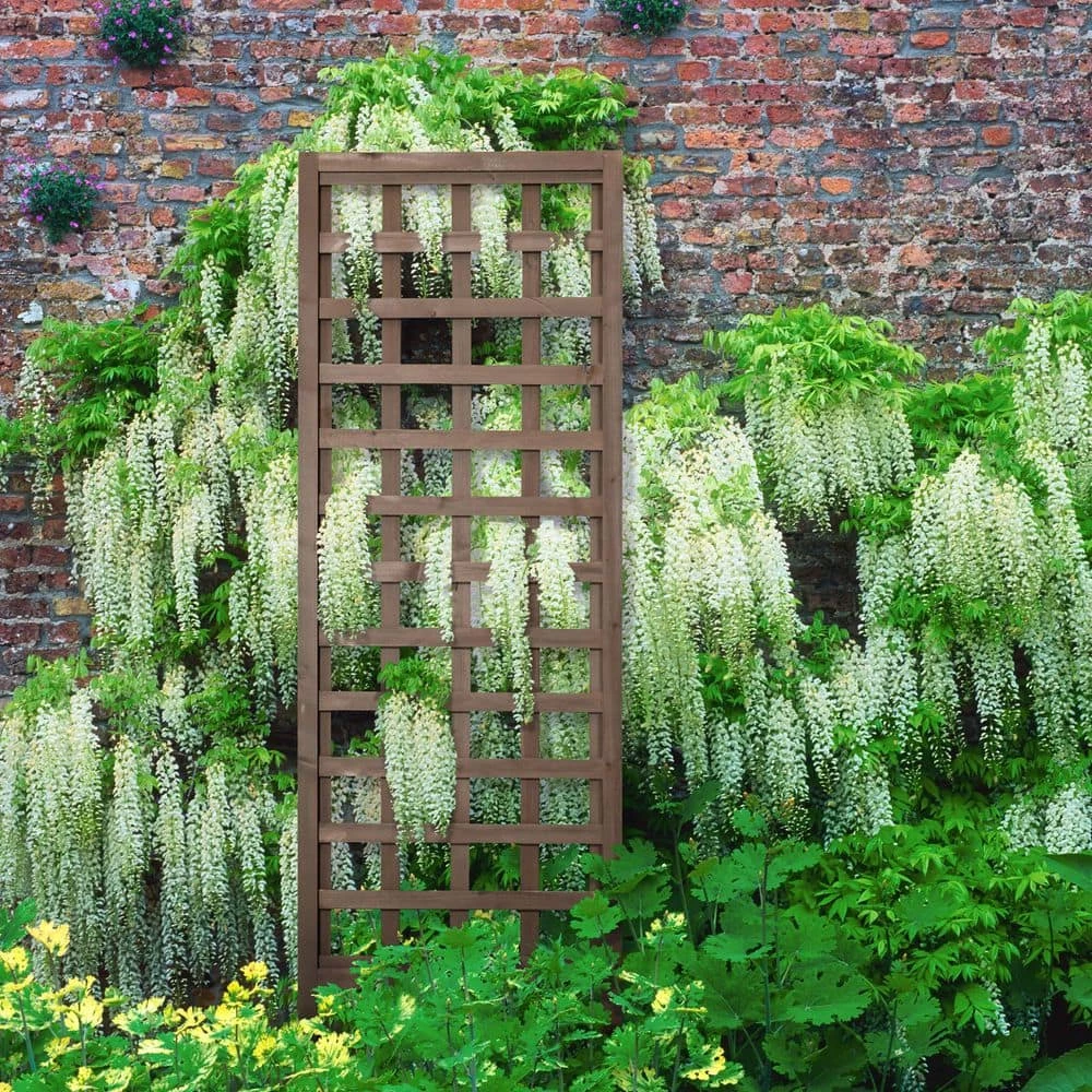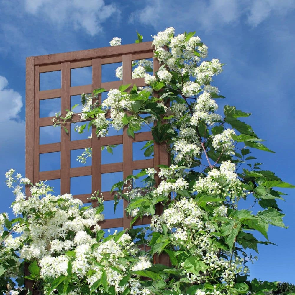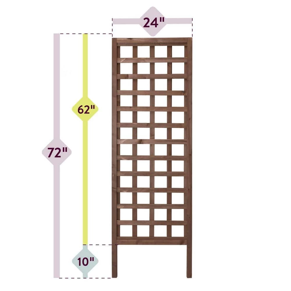 Bring life to your garden space with this Outdoor Essentials Heirloom 72 in. Walnut‐Tone Square Lattice Trellis. Give your climbing plants room to grow. It’s the perfect way to add vertical space to your garden; simply stake it into the soil, attach it to a fence, and lean it against a wall. Made with durable, color-treated pine for a classic lattice design. Our trellis comes pre‐assembled for easy installation.